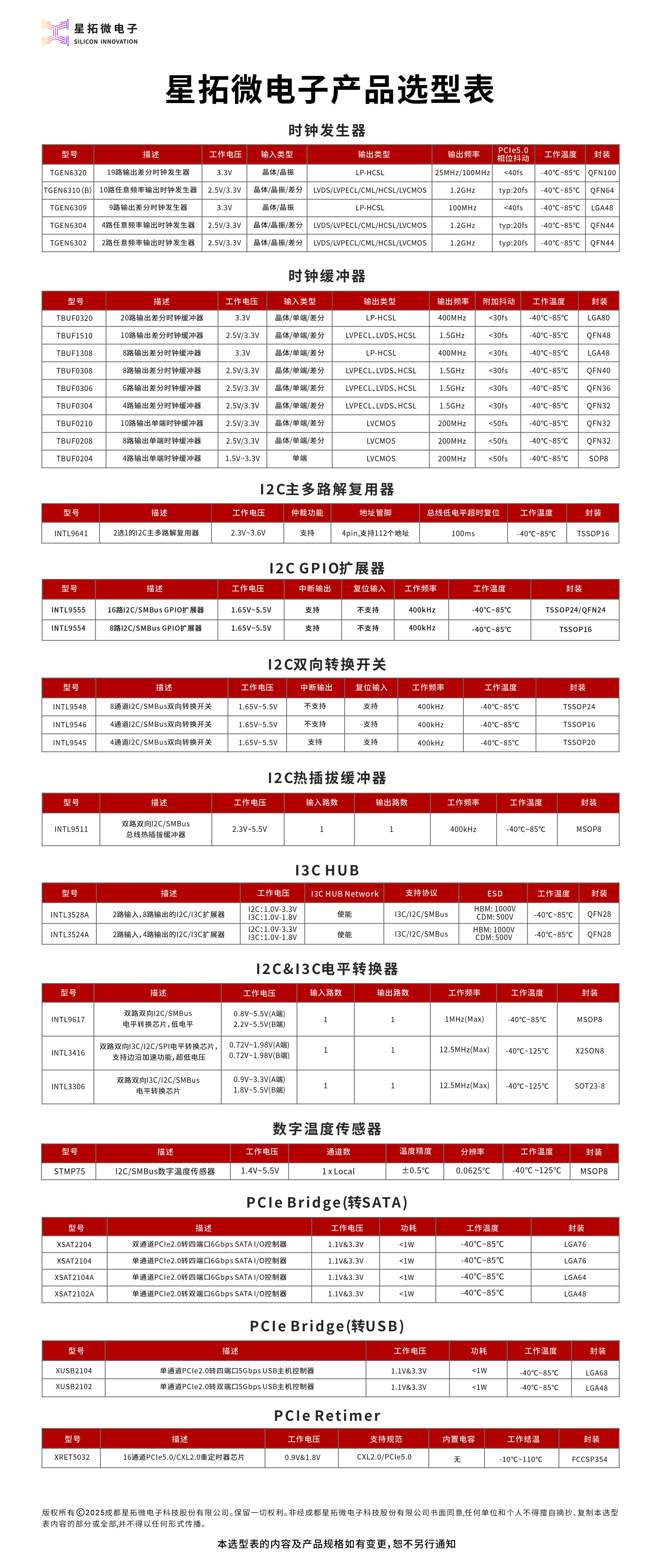 | 型号 | 工作电压 | 输入类型 | 输出类型 | 输出频率 | PCIe Gen5 Phase Jitter | 输出路数 | 工作温度 | 封装 |